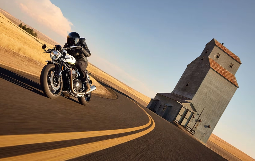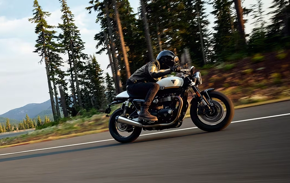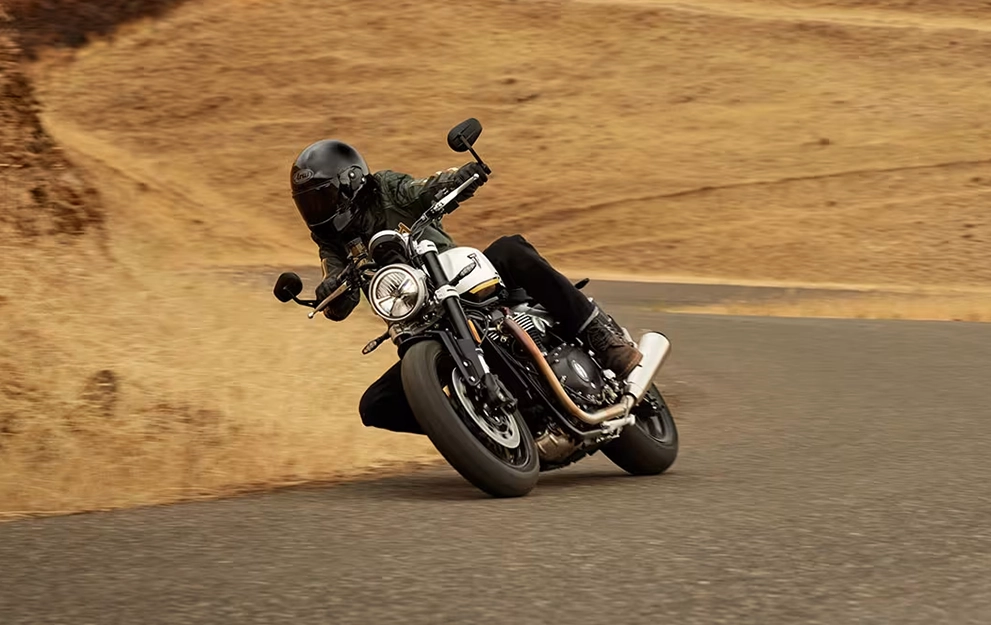Impressionante e exigente, o design elegante e minimalista da Speed Twin 1200 evoluiu. O tanque de combustível inclinado, com recortes frontais profundos, apresenta um design definido e imponente. As coberturas do corpo do acelerador minimalistas têm acabamento em alumínio escovado e se integram aos painéis laterais no estreito quadro traseiro.